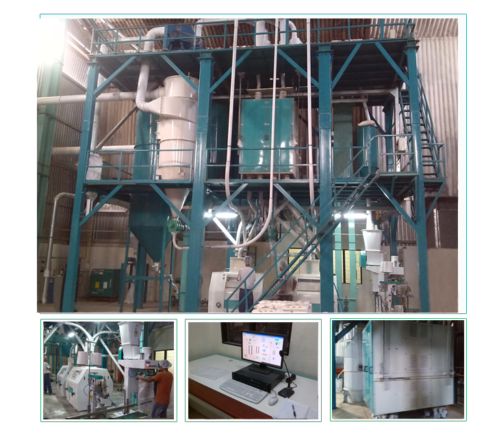 我公司安裝在薩爾瓦多40噸/天大米米粉加工工藝。清理工藝采用一篩一吸風,制粉工藝采用MMD25/60兩臺全自動氣壓磨粉機四道研磨,一臺四倉FSFG4×24高方篩,整條生產線全自動PLC控制,管道全封閉通風除塵。生產米粉可根據客戶不同要求通過調整篩網配備達70~150目。自動化程度高,節省人力;采用鋼架結構,設備緊湊,布置整齊美觀,占地面積小;密閉通風為主,清掃為輔,車間衛生條件好;生產操作靈活,適應廣大客戶群眾。