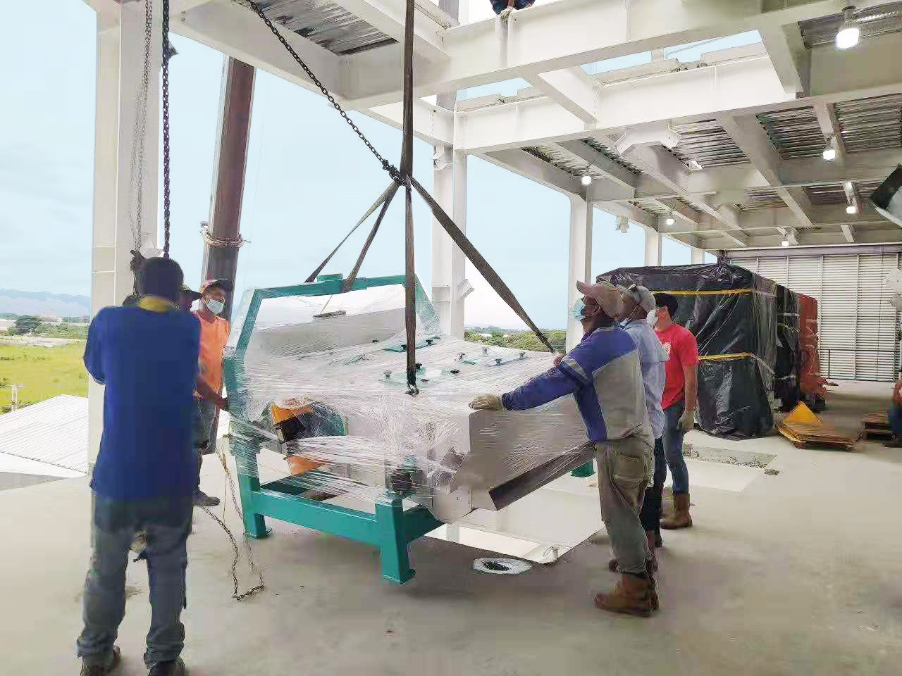 該套設(shè)備的鋼架結(jié)構(gòu)廠房已順利完成組裝。具備了設(shè)備吊裝條件。目前面粉機(jī)械裝配工作正有序進(jìn)行。