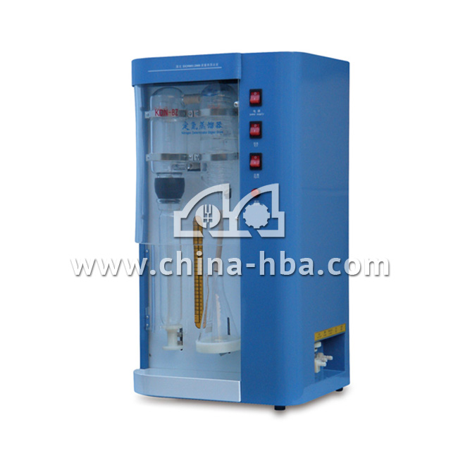 KDN-BZ 定氮蒸餾器是依據經典的凱氏定氮原理研制生產蛋白質測定儀的主要組成部分之一。其主要特點是:采用電熱管加熱,使蒸餾水產生蒸汽。蒸汽發生器內水位由液位控制器控制,每蒸餾完一個試樣,蒸汽發生器內蒸餾水自動補充,對已消化的試樣進行蒸餾,將消化過程中產生的硫酸銨轉化為氨,并與硼酸反應生成硼酸氫銨,經滴定、計算得出試樣粗蛋白質的含量。